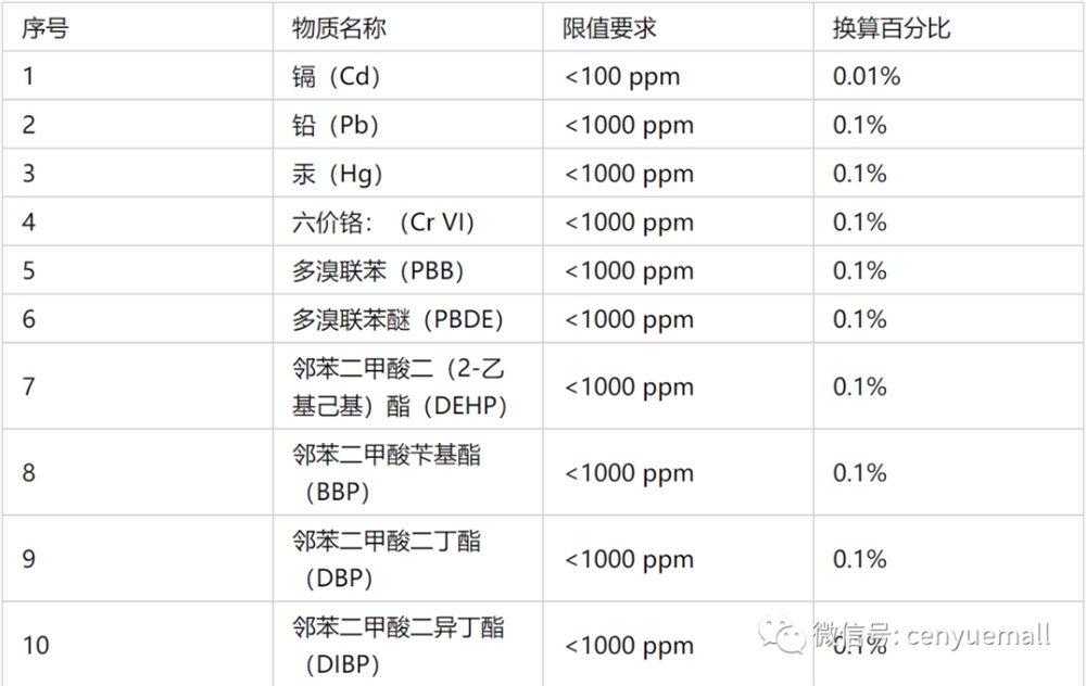 其中VOCs和放射性物質(zhì)氡的檢測(cè)報(bào)告可以參考《GB50235-2020》,對(duì)涂料、膠黏劑、瓷磚、人造木制品板材、木塑材料以及帶自粘性質(zhì)的墻紙、塑料膜類、軟質(zhì)地板等都做出了VOC和氡的限量要求。重金屬和鹵素可以參照ROHS2.0,關(guān)于限值如下表所示